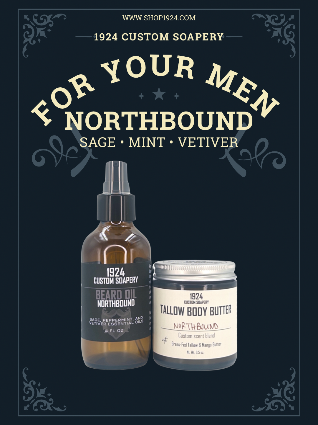 Northbound features a clean, grounded scent of sage, mint, and vetiver. Fresh mint opens with a crisp, cooling note, followed by herbaceous sage. Vetiver anchors the blend with warm, earthy depth and subtle leather-like undertones, creating a masculine scent that feels rugged, balanced, and easy to wear every day.